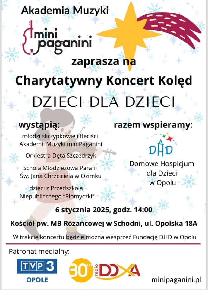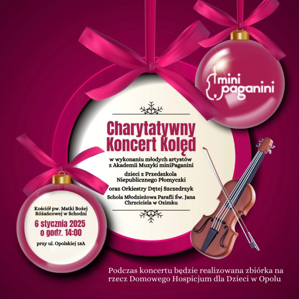 W kościele pw. Matki Bożej Różańcowej w Schodni odbył się charytatywny koncert kolęd. Już po raz 10., młodzi muzycy, dzieląc się swoim talentem zachęcali do wsparcia szczytnego celu. W tym roku po raz trzeci zagrano dla podopiecznych Domowego Hospicjum dla Dzieci w Opolu. Wystąpili Młodzi artyści z Akademii Muzyki miniPaganini; Dzieci z Przedszkola Niepublicznego Płomyczki; Orkiestra Dęta Szczedrzyk i Schola Młodzieżowa Parafii Św. Jana Chrzciciela w Ozimku.