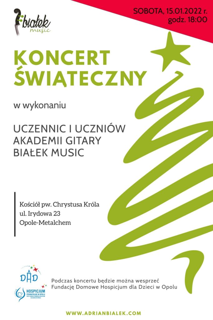 W sobotę – 15 stycznia, o godzinie 18.00 w kościele pw. Chrystusa Króla w Opolu – Metalchem przy ul. Irydowej 23. Podczas koncertu można było wesprzeć datkami Fundację Domowe Hospicjum dla Dzieci w Opolu. DZIĘKUJEMY za inicjatywę Panu Adrianowi Białkowi oraz jego zdolnym uczniom za piękny koncert! Dziękujemy wszystkim Darczyńcom za przekazane datki na rzecz hospicjum!