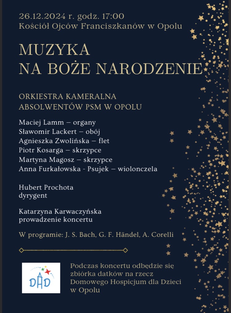 Tłumy Opolan zgromadziły się w kościele oo. franciszkanów w Opolu na bożonarodzeniowym koncercie w wykonaniu uczniów i absolwentów Państwowej Szkoły Muzycznej I i II stopnia imienia Fryderyka Chopina w Opolu pod kierunkiem Huberta Prochoty .