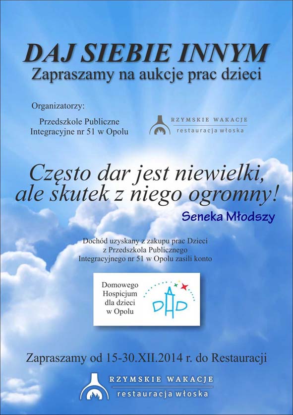 Przedszkole Publiczne Integracyjne nr 51 w Opolu zorganizowało aukcje prac dzieci, z której dochód zasilił konto Fundacji. Do akcji włączyła się restauracja „Rzymskie Wakacje”. Dziękujemy organizatorom, dzieciaczkom i ich rodzicom za wsparcie.