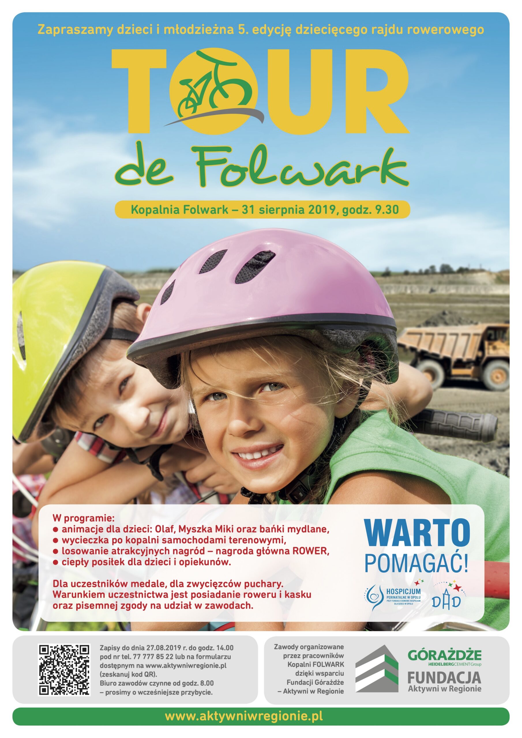Dziękujemy za zaproszenie Organizatorom 5 Dziecięcego Rajdu Rowerowego Tour de Folwark. Pracownikom Kopalni Folwark, Grupa Górażdże, Fundacja Górażdże Aktywni w Regionie, oraz wszystkim uczestnikom rajdu dziękujemy za finansowe wsparcie działalności Domowego Hospicjum dla Dzieci w Opolu. Gorąca atmosfera, mnóstwo atrakcji, jeszcze więcej uśmiechu, prawdziwe, sportowe emocje, a przy tym wiele cudownych otwartych serc. Piękna impreza! Gratulujemy i dziękujemy! Dziękujemy również WOLONTARIUSZOM Hospicjum za obecność i pomoc w zbiórce pieniędzy!