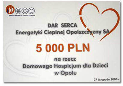 Ponad 50 tysięcy złotych przekazała ECO dla sześciu opolskich organizacji pożytku publicznego. – „Misją firmy jest zaopatrywanie w ciepło, nie tylko takie w kaloryferach” – powiedział Pan Prezes Wiesław Chmielowicz. Nasza Fundacja otrzymała 5 000 zł. Uroczyste przekazanie darowizny odbyło się w salce Parafii Św. Józefa w Opolu Szczepanowicach.