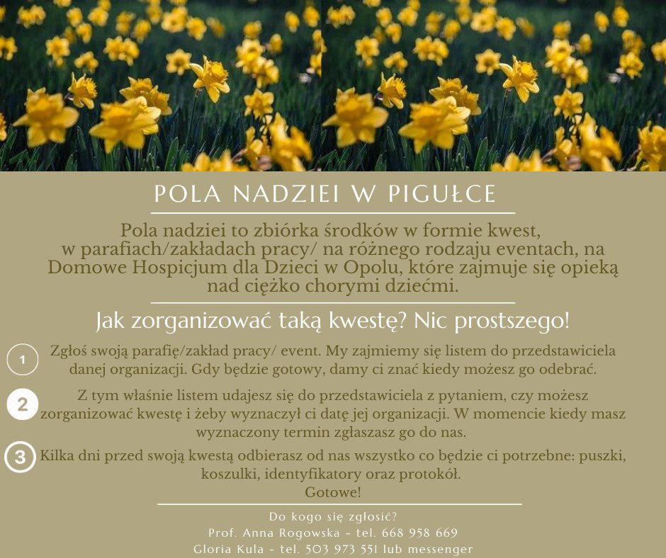Wiosną, kiedy żonkile kwitną, szerzona jest idea opieki hospicyjnej i zbierane są fundusze na jej prowadzenie. W Opolu Pola Nadziei na rzecz Domowego Hospicjum dla Dzieci kwitną od 2009 roku. Akcja ta stała się już tradycją, tegoroczne Pola Nadziei mają swoją 13 edycję. Z powodu pandemii mają niestety inną odsłonę, jednakże ich idea i przesłanie […]