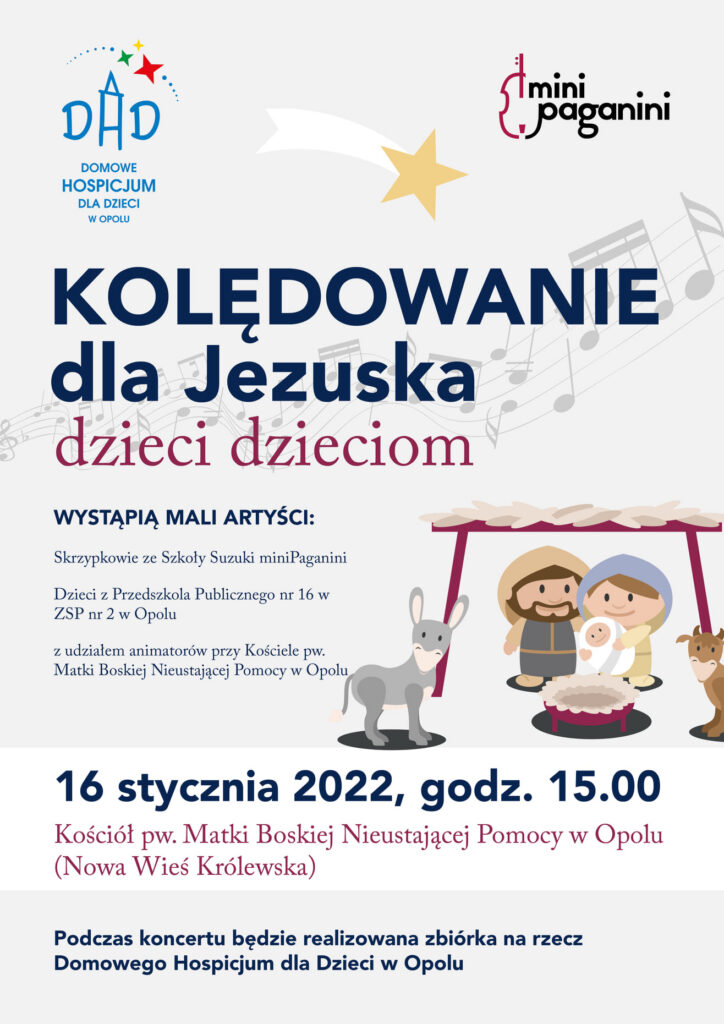 W niedzielę 16 stycznia o godz. 15.00 miał miejsce koncert małych artystów, który odbył się w Kościele pw. Matki Boskiej Nieustającej Pomocy w Opolu – NOWA WIEŚ KRÓLEWSKA, przy ul. Plac Kościelny 1. Podczas koncertu Wolontariusze zbierali datki na Fundację Domowe Hospicjum dla Dzieci w Opolu. Dziękujemy za inicjatywę Pani Agnieszce Wojszczyk, oraz młodym artystom […]