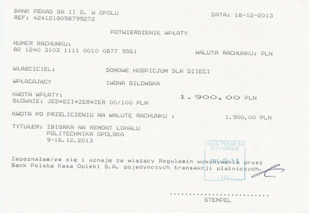 Dziękujemy Zarządowi PGE Elektrownia Opole SA za piękny i ciepły gest, wszystkim Gościom składamy serdeczne podziękowania za hojne wsparcie.
