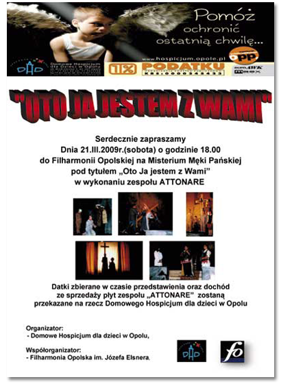 Domowe Hospicjum dla Dzieci w Opolu zaprasza do Filharmonii Opolskiej na Misterium Męki Pańskiej pod tytułem „OTO JA JESTEM Z WAMI” w wykonaniu Zespołu Attonare z Komprachcic. Przedstawienie odbędzie się w dniu 21 marca 2009 r. w sobotę o godzinie 18.00. Wstęp bezpłatny. Po przedstawieniu będzie możliwość zakupienia płyt Zespołu, całkowity dochód będzie przekazany na […]